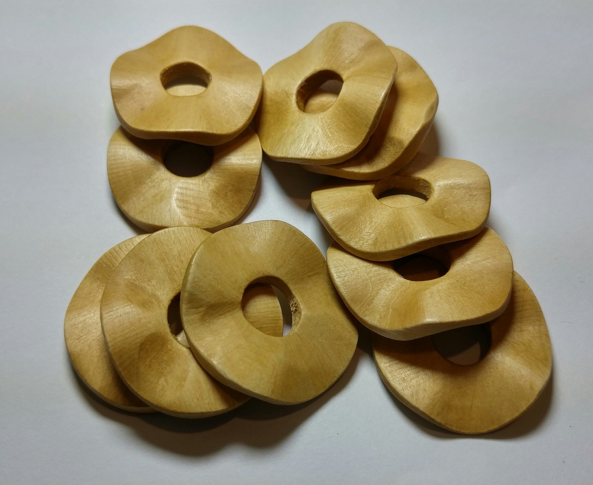 This lot is for 10 wavy hand cut wood donuts. 33mm. Unique and earthy pieces to get creative with! These are undrilled pieces.