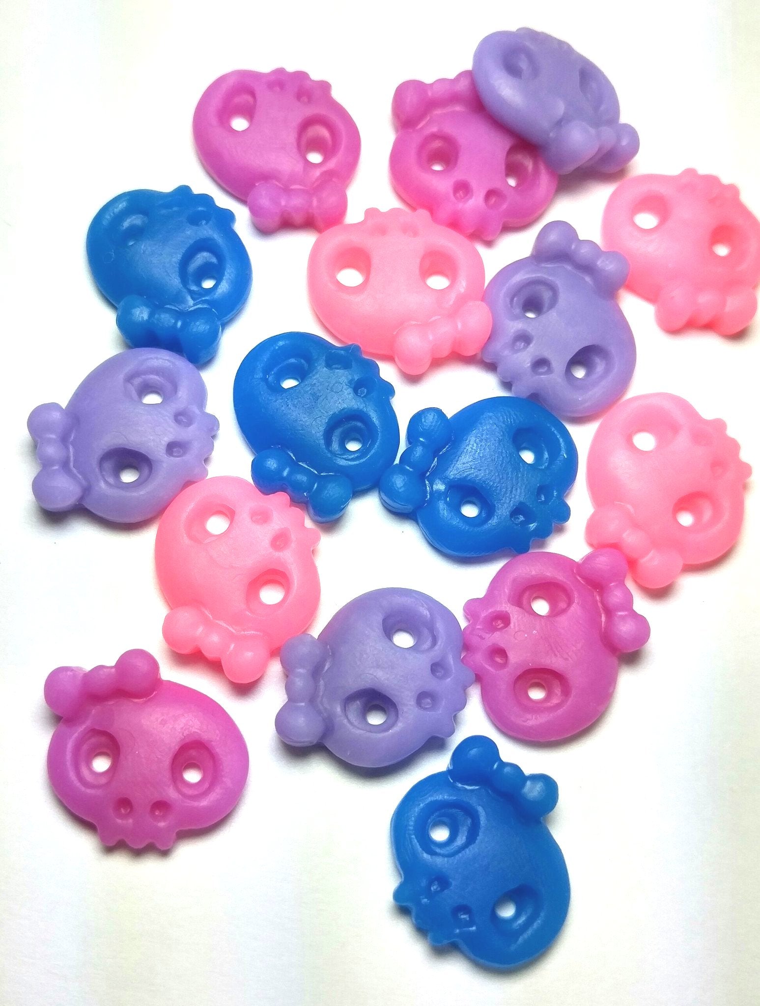 This lot is for 16 acrylic girly girl skulls. These are good for many projects, buttons, and/or links. Super cute and great colors! 16mm.