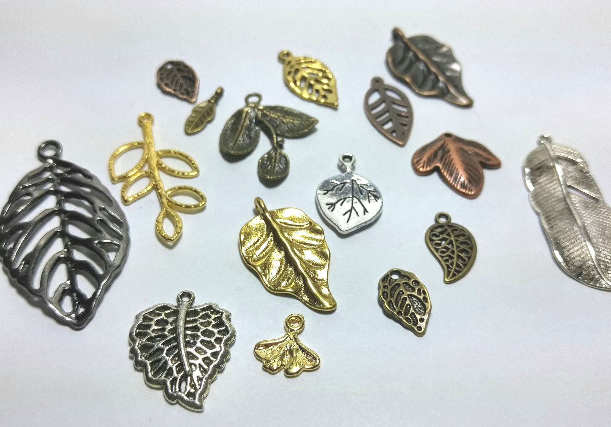 This lot is for 20 leaf charms in assorted styles and tones. Great detailing and super cute!