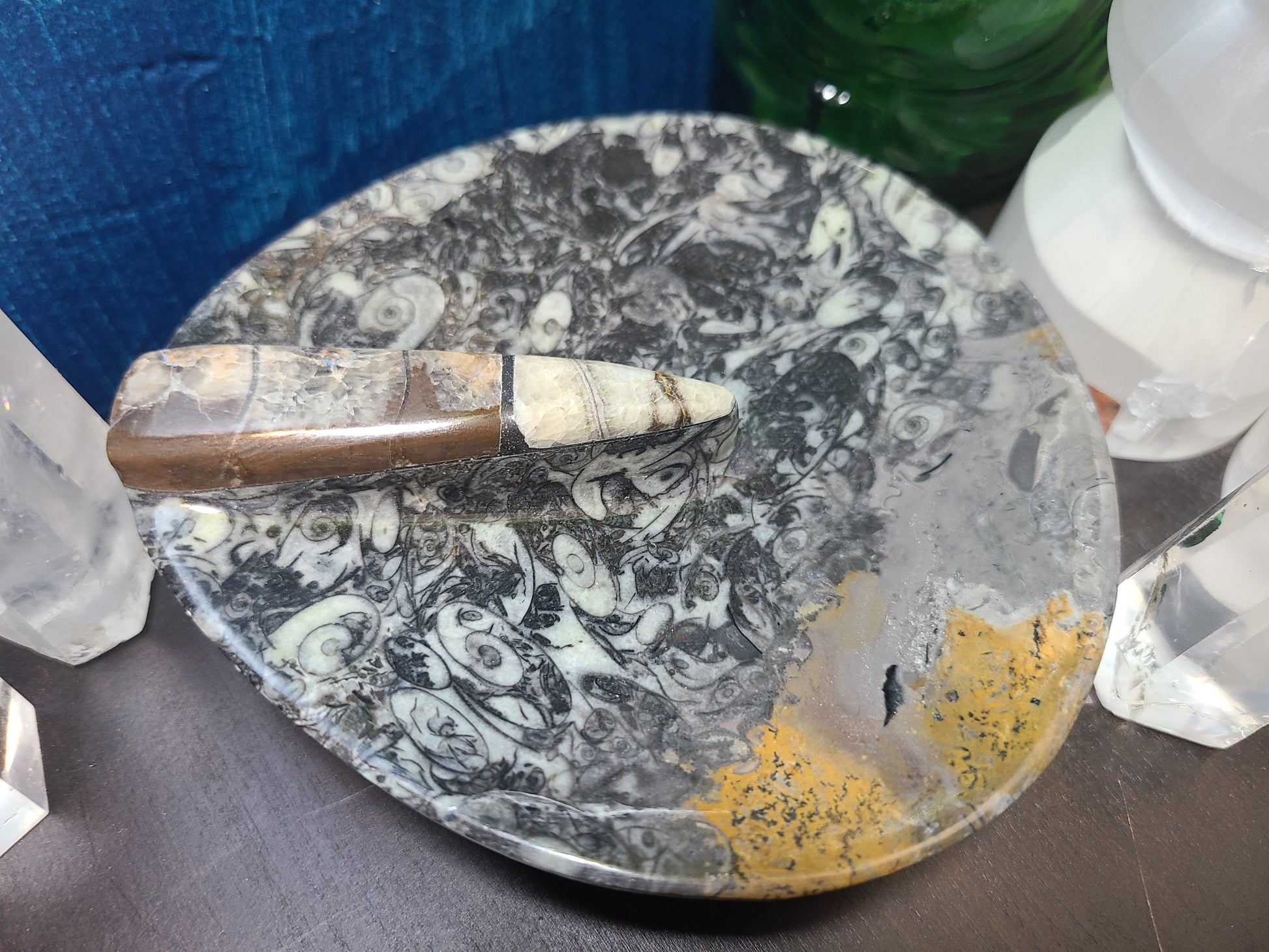 Carved and polished ammonite/orthoceras fossil dish. Great for holding jewelry and small keepsakes.