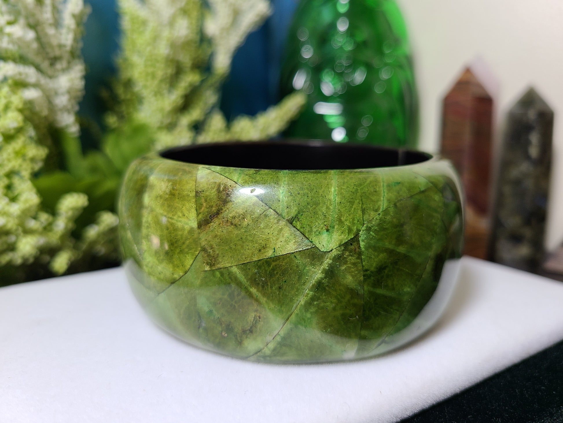 Chunky eye catching green bangle is made out of wood, shell, and resin. Made in the Philippines.