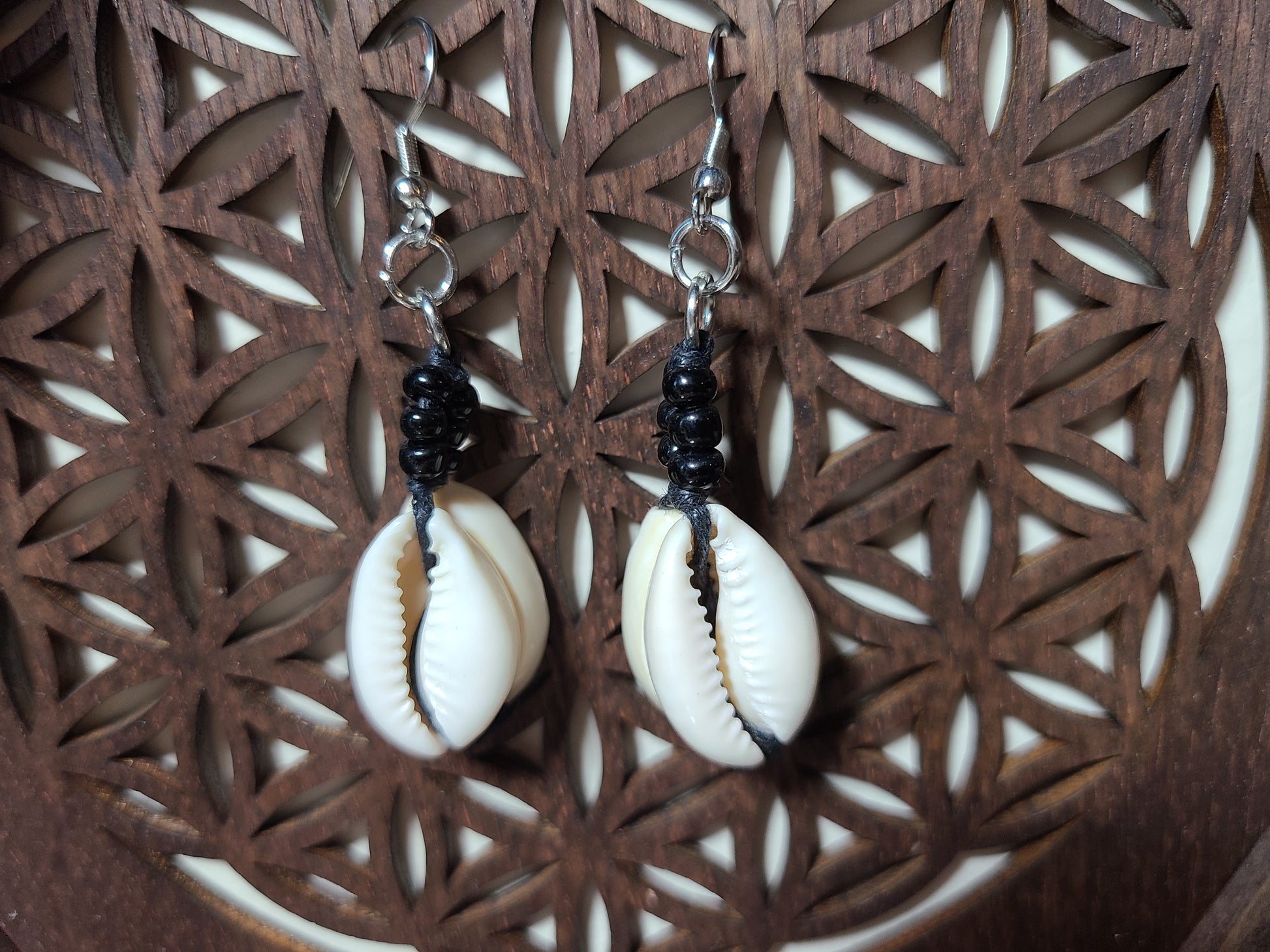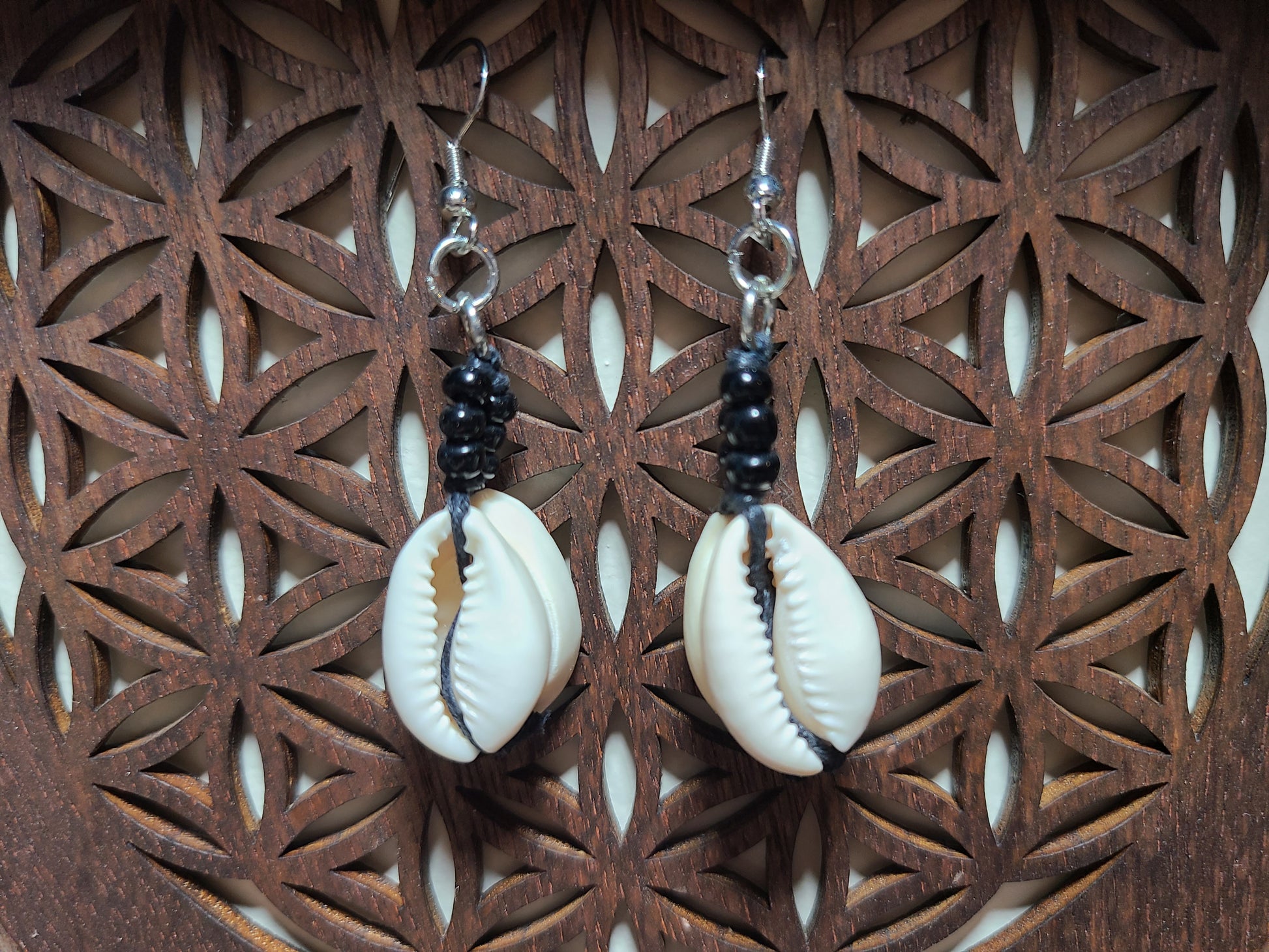 Double sided cowrie shell drop earrings. Perfect for everyday wear.