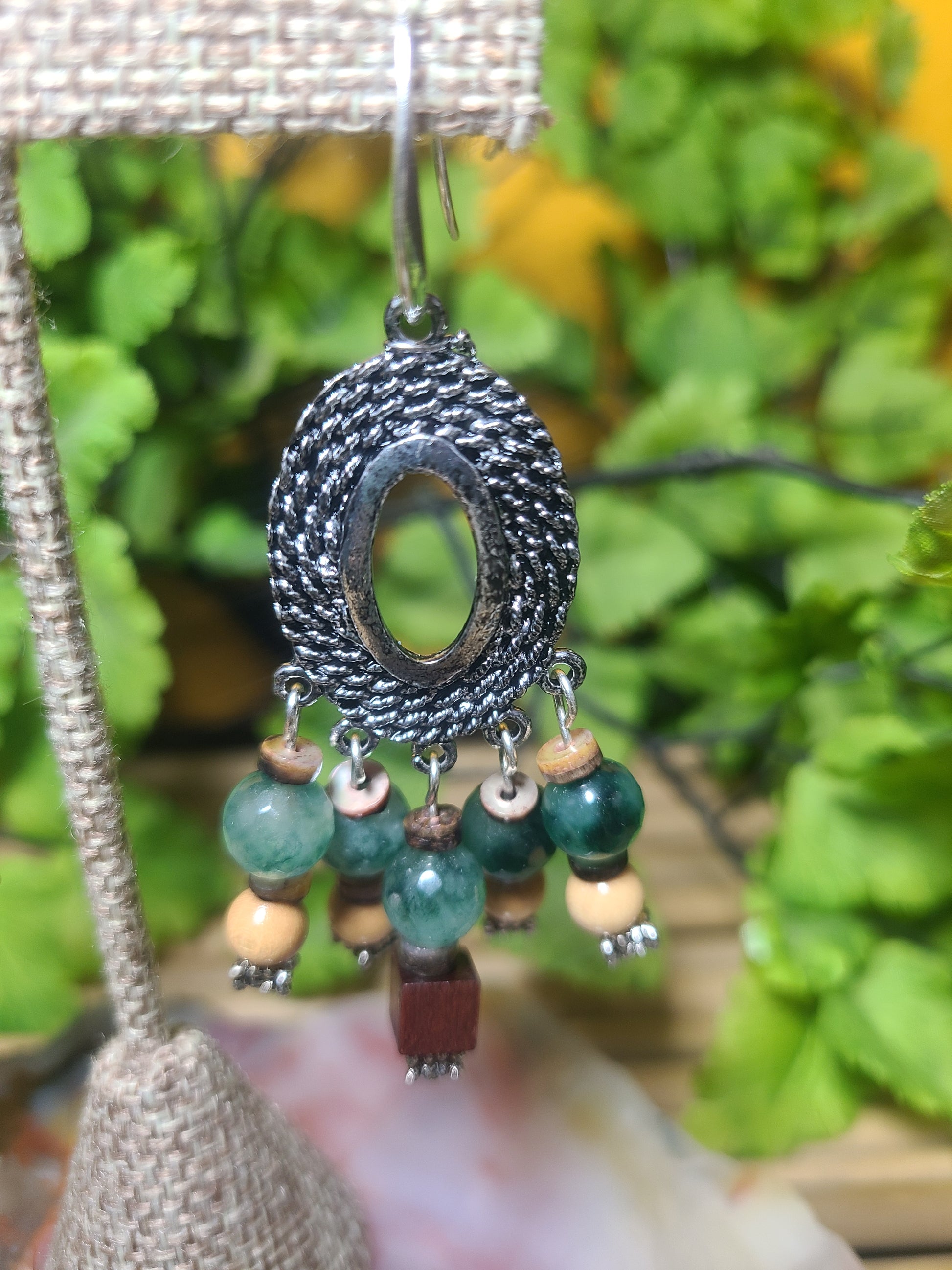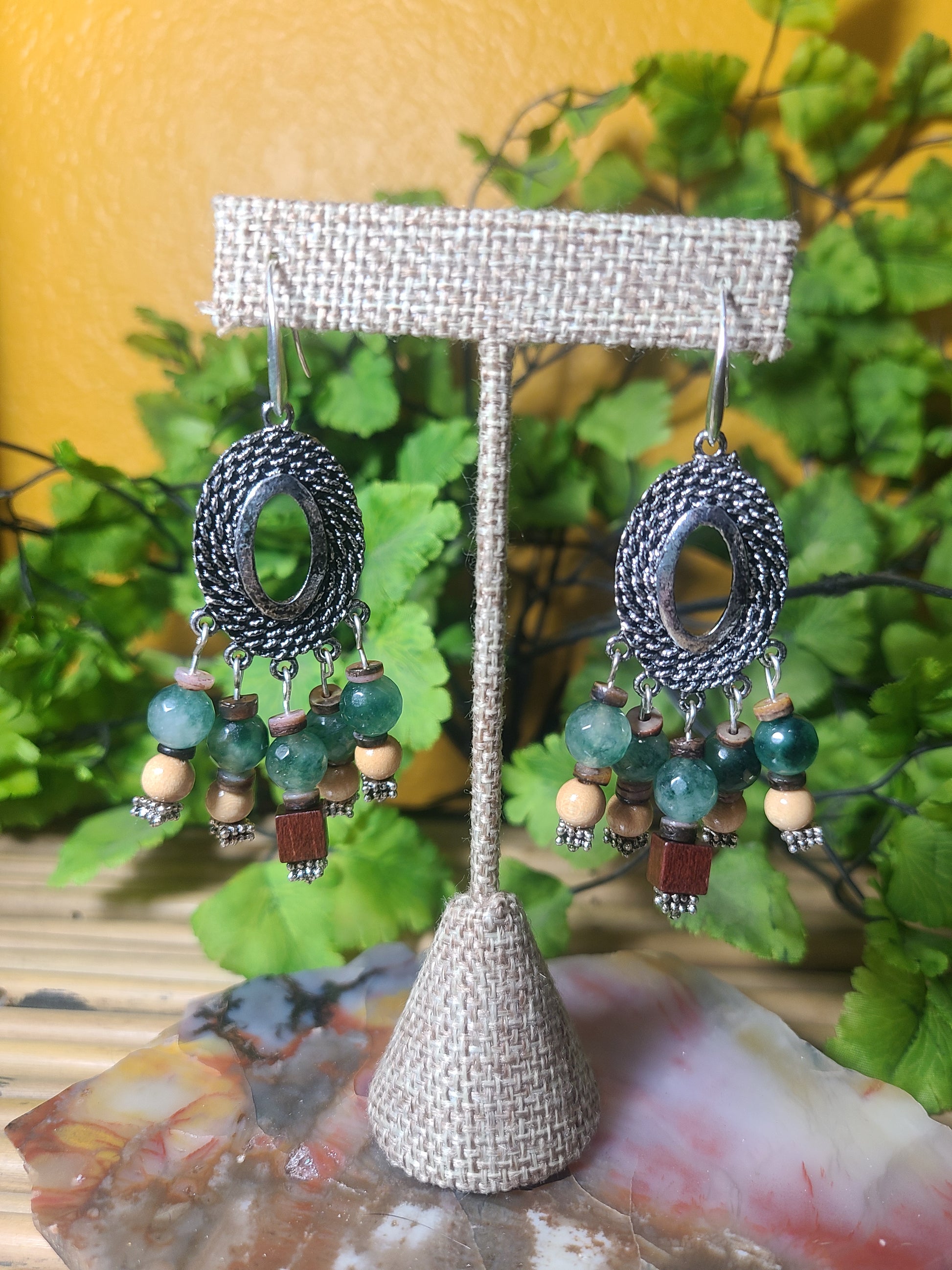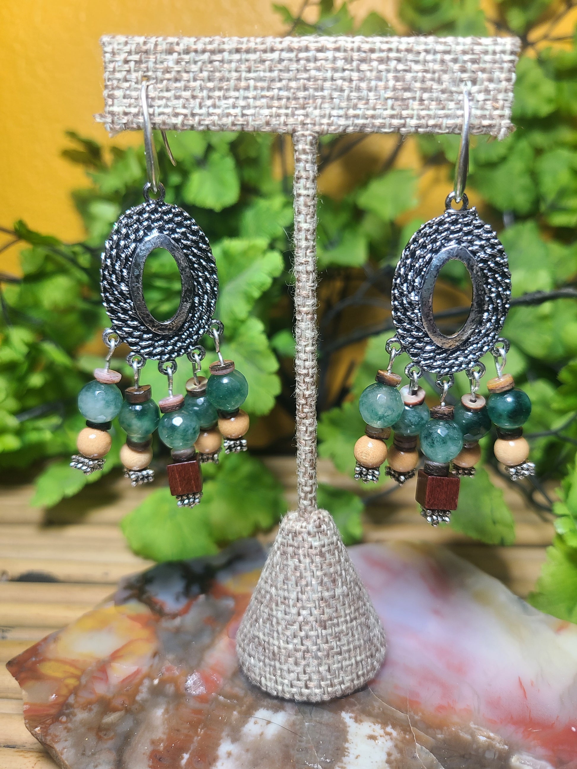 These OOAK chandelier earrings were handmade by me, inspiredby hikes in the forest. They feature faceted Agate, wood, and shell beads.