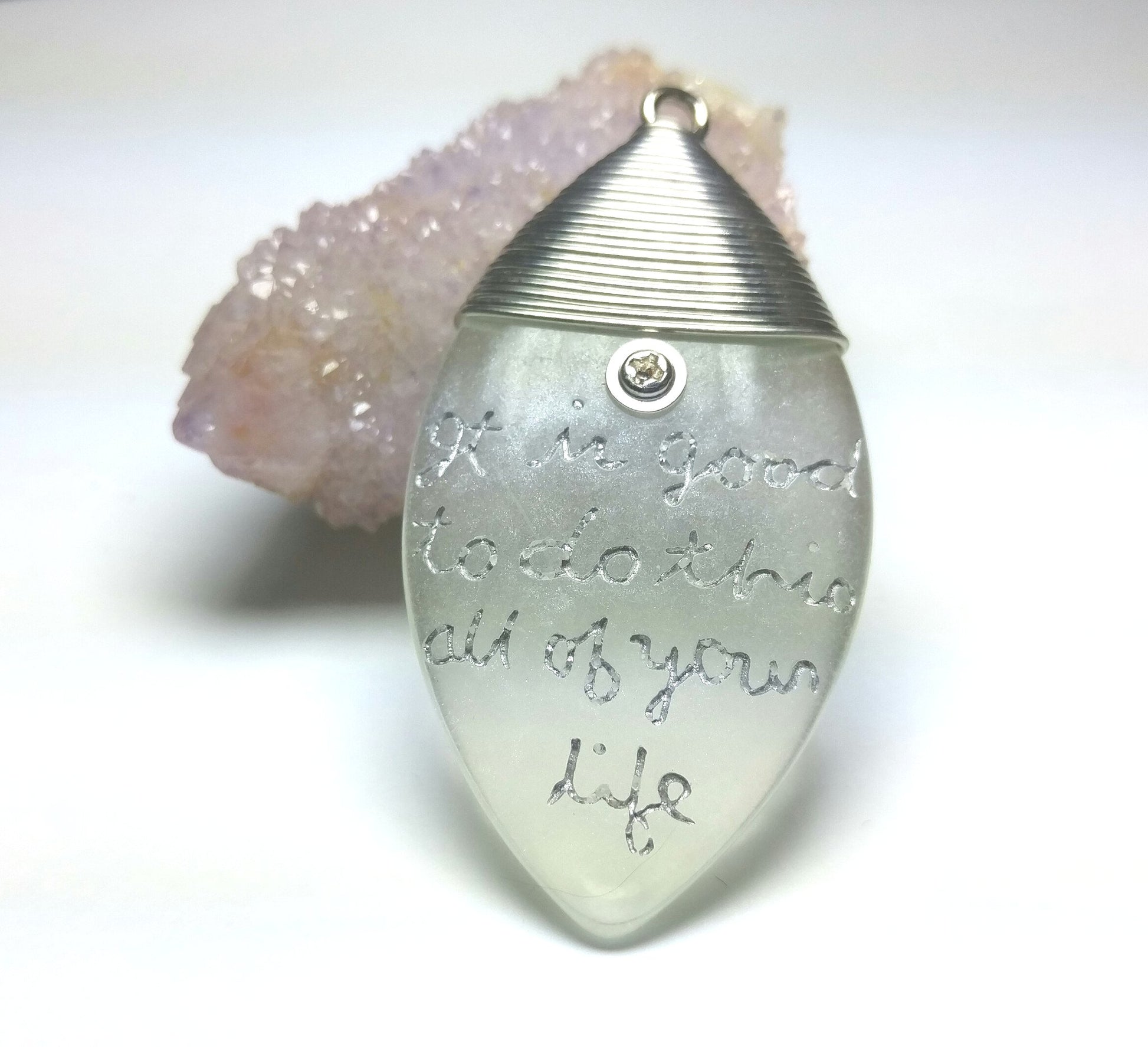 This lot is for one clear inspirational acrylic pendant. Wire wrapped and with the phrase...It is good to do this all of our life....Very cute pendant! Excellent quality! 50mm.
