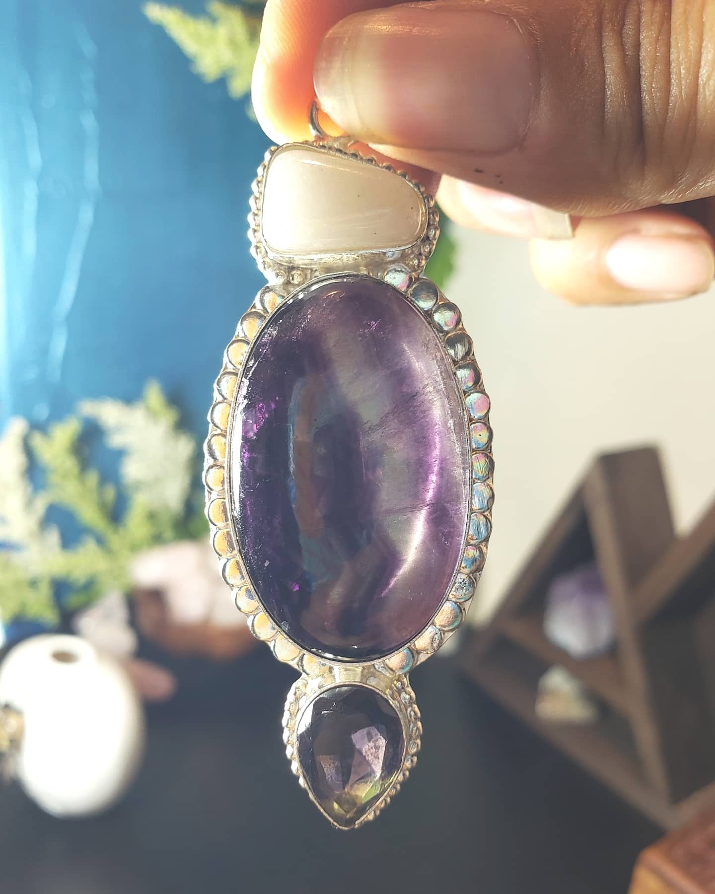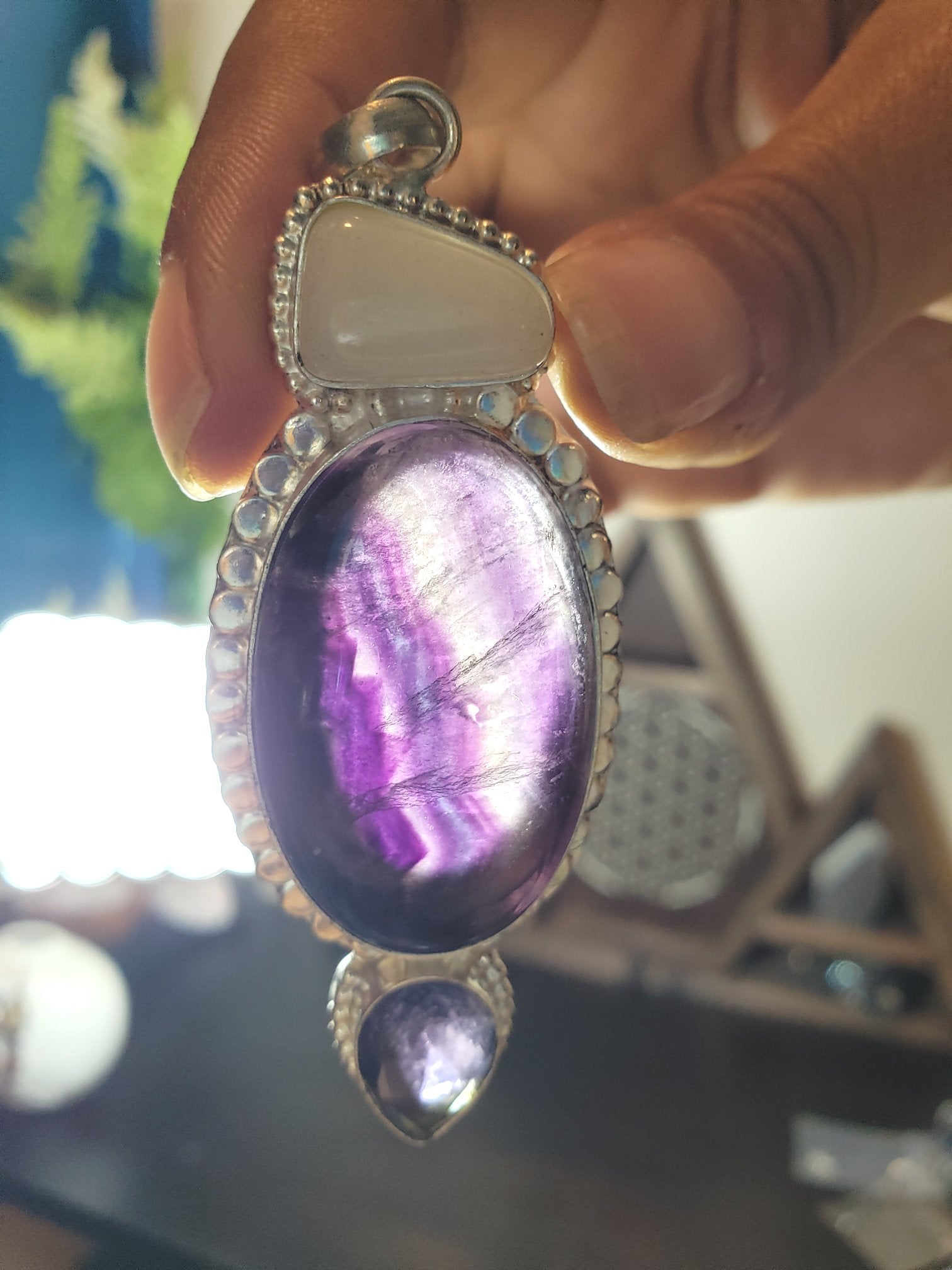 Natural Dolomite, Chevron Amethyst, and Tanzanite come together in this unique pendant💜. 3in.