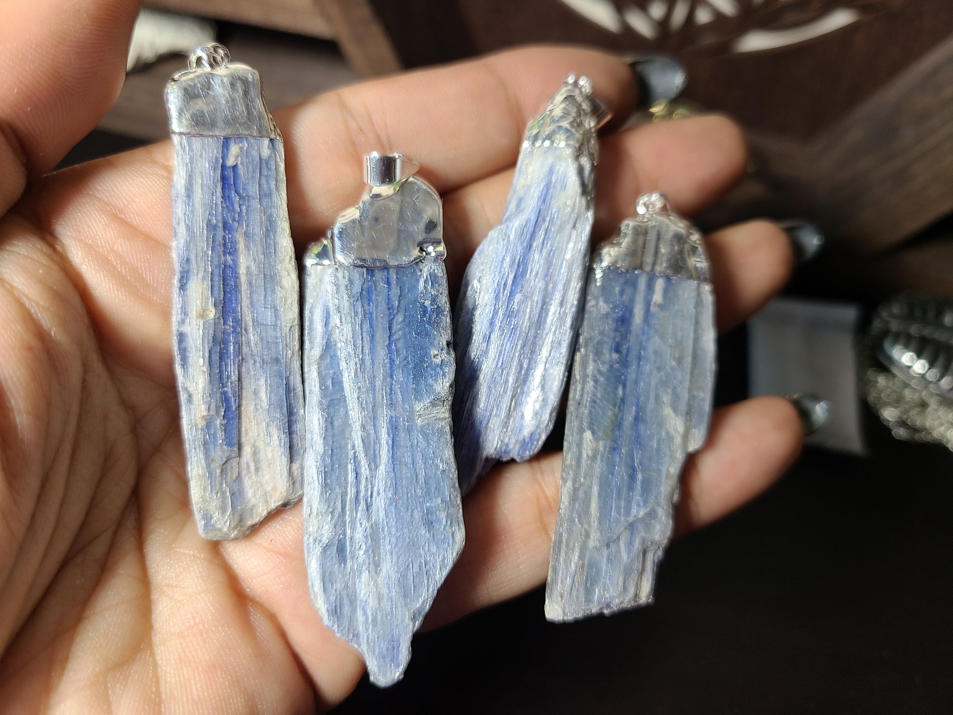 This listing is for one raw blue kyanite pendant with silver bail. Natural stone so they will each vary.